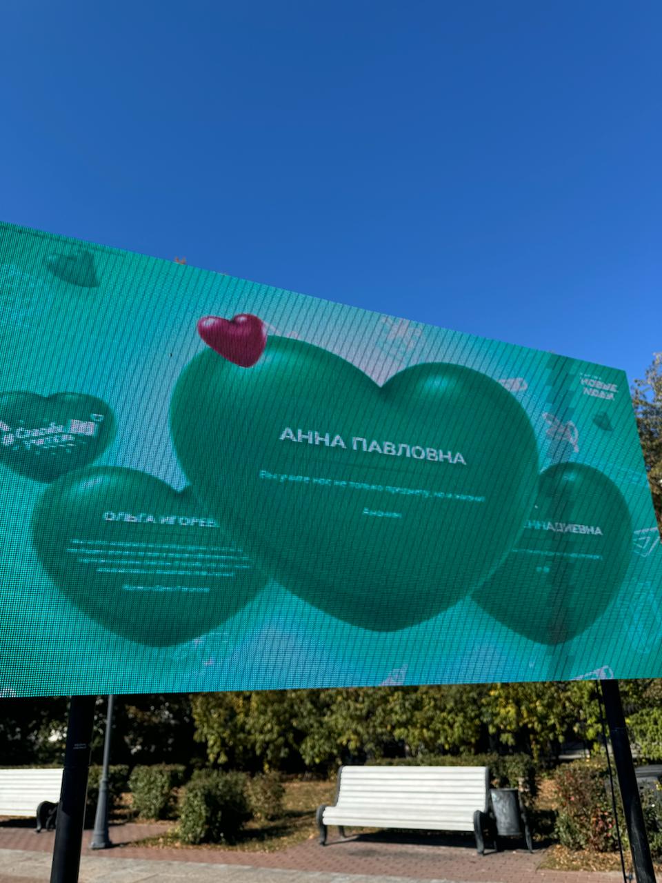 На больших цифровых экранах в реальном времени транслировались слова признательности педагогам. Оставить послание мог любой желающий через специальный чат-бот, после чего на экране появлялось «сердце благодарности» с именем учителя и школой.