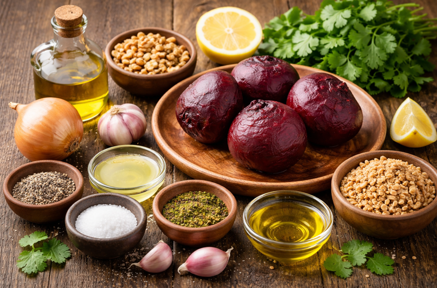 Для приготовления понадобятся доступные продукты: свекла, репчатый лук, грецкие орехи, чеснок, лимонный сок, растительное масло, специи и свежая зелень. Все это легко найти в любом магазине, что делает рецепт удобным для повседневного меню.