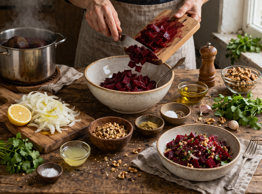 Свеклу лучше отварить заранее и полностью остудить, затем нарезать крупными кусочками. Лук нарезают тонкими полукольцами и слегка маринуют с лимонным соком и маслом — это помогает убрать лишнюю горечь. Орехи рубят, чеснок и зелень измельчают, после чего все ингредиенты соединяют и аккуратно перемешивают.