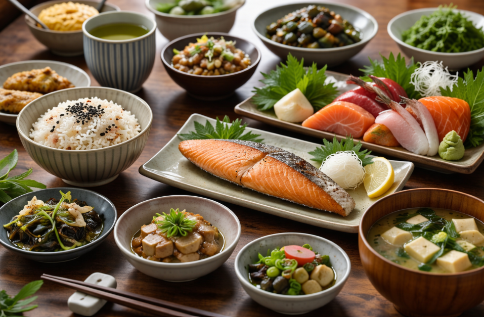 Рацион японцев строится на натуральных и минимально обработанных продуктах. В ежедневное меню входят рыба, морепродукты, рис, овощи, водоросли и соевые продукты.